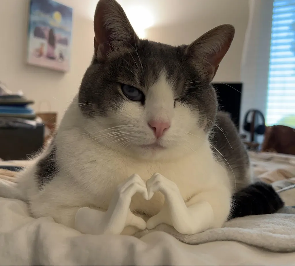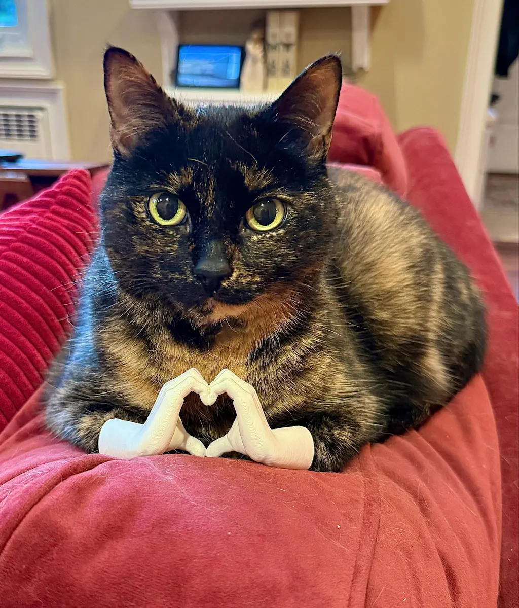- One pair of tiny 3D-printed hands, sized for a cat in loaf position